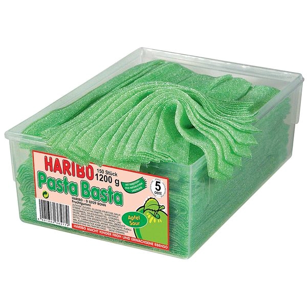Sukker, glucosesirup, stivelse, fugtighedsbevarende middel (sorbitol sirup), HVEDEMEL, syrer (citronsyre, æblesyre), syreregulering (natriumhydrogenmalat), emulgeringsmiddel (mono- og diglycerider af fedtsyrer), aroma, farvestoffer (curcumin, kobberkomplekser af chlorophylliner). Kan indeholde spor af mælk.
