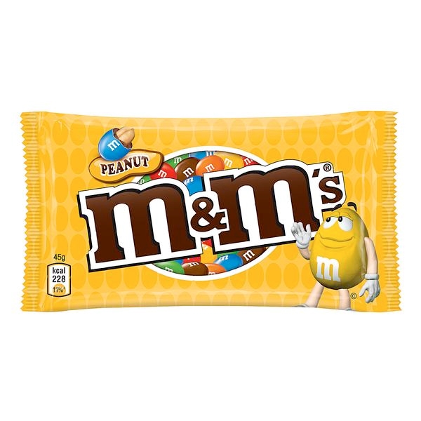 Sukker, JORDNØDDER, kakaomasse, SØDMÆLKSPULVER, kakaosmør, stivelse, palmefedt, glukosesirup, SKUMMMETMÆLKSPULVER, emulgator (SOJALECITHIN), LACTOSE, stabilisator (gummi arabicum), sheafedt, smørfedt (fra MÆLK), dextrin , farver (E100, E120, E133, E160a, E160e, E170), overfladebehandlingsmiddel (carnaubavoks), palmekerneolie, aroma, salt. Kan indeholde indeholde Hasselnødder og Mandel.