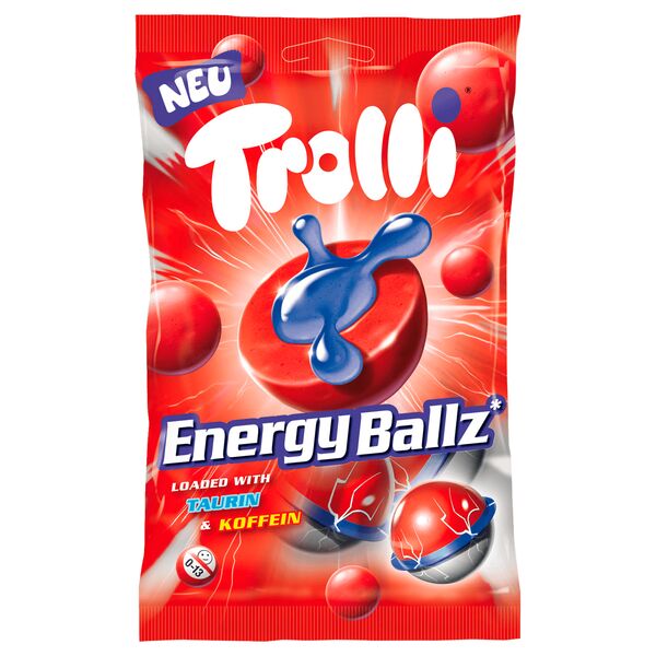 Glukosesirup, sukker,dextrose, gelatine, syrningsmidler (citronsyre), farvende fødevarer (gulerod, sød kartofel), TAURIN (0,66%), gelerings middel (pektin), aroma, KOFFEIN (0,053%), farve (brilliant blue FCF), overfladebehandlingsmiddel (bivoks hvid og gul).